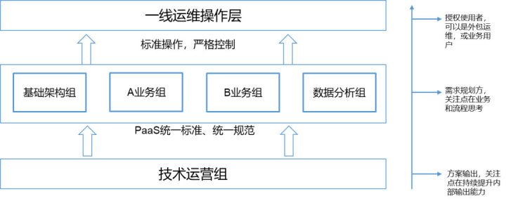 從基于PaaS的運(yùn)維技術(shù)架構(gòu)的變化趨勢來看,如果把運(yùn)維組織看成是一種技術(shù)架構(gòu),應(yīng)該有一個(gè)“運(yùn)維引擎型組織”來輸出運(yùn)維解決方案到外面的世界。在基于PaaS的技術(shù)運(yùn)營體系下,這個(gè)組織稱為技術(shù)運(yùn)營組。