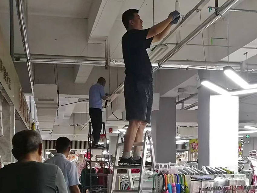 高新店街市改造,王金文和劉軍偉自己動(dòng)手為燈光較暗的區(qū)域安裝燈管。