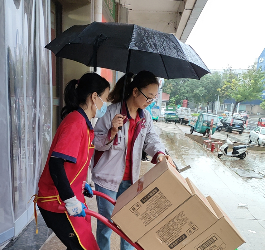 10月18日,民生店同事齊心協(xié)力、冒雨奮戰(zhàn),確保商品未濕損的同時(shí)迅速卸貨,以便后續(xù)團(tuán)購業(yè)務(wù)及時(shí)配送。