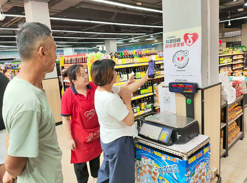 民生店張慕華熱情幫助顧客操作抖音掃碼,以方便顧客實時了解門店線上活動、購買線上特價商品。
